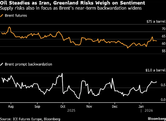 西太平洋银行大宗商品及碳研究主管罗伯特・伦尼表示:“布伦特原油的价格走势正陷入一场复杂的博弈,一方面是地缘政治风险不断攀升,另一方面则是产量和库存持续增加。”他指出,若伊朗境内局势出现急剧恶化,原油价格或将突破每桶70美元关口;不过当前市场的短期关注点已从伊朗转向格陵兰岛,这一转变正对油价形成利空压力。